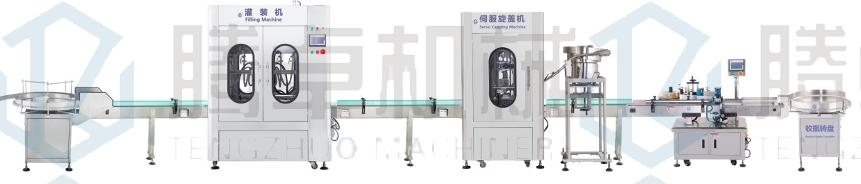 1.全自動生產線流程:人工把瓶放到送瓶轉盤上-自動灌裝-自動理蓋下蓋-自動旋蓋-自動打碼-自動貼標-人工收瓶