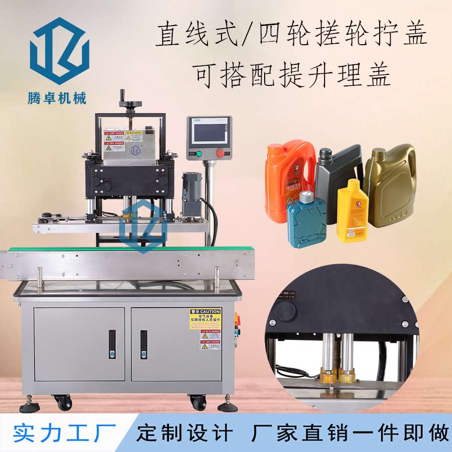 本機(jī)主要適用于螺絲紋平頭塑料蓋旋蓋擰緊,例:潤滑油桶、礦泉水瓶、藥瓶、日化用品、飲料瓶等。調(diào)節(jié)簡單,使用方便。可兼容多種瓶子蓋子。
